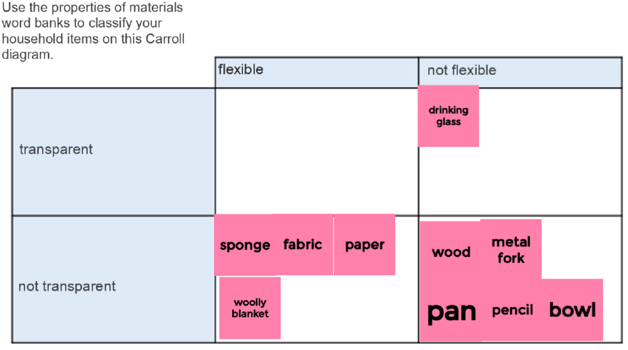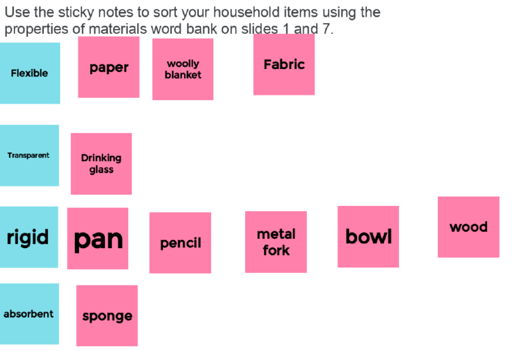 Using a Google Jamboard with a word bank from the ASE resource, the children were asked to find items around their house with the different properties. They then sorted these on using the Jamboard ‘sticky notes’ to move them into different categories.